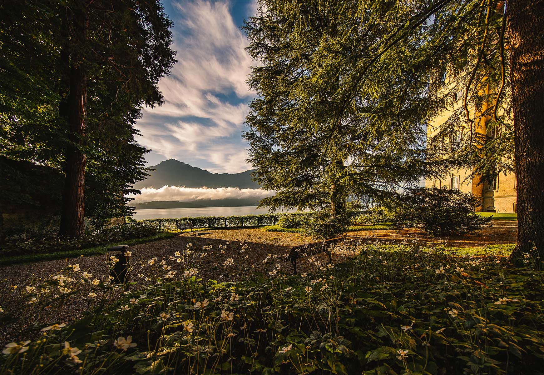 Le azioni nel parco storico sono puntuali e coerenti con il lessico dei giardini del Lago di Como, mentre il ripiano est, anticamente destinato a brolo, viene completamente ripensato.